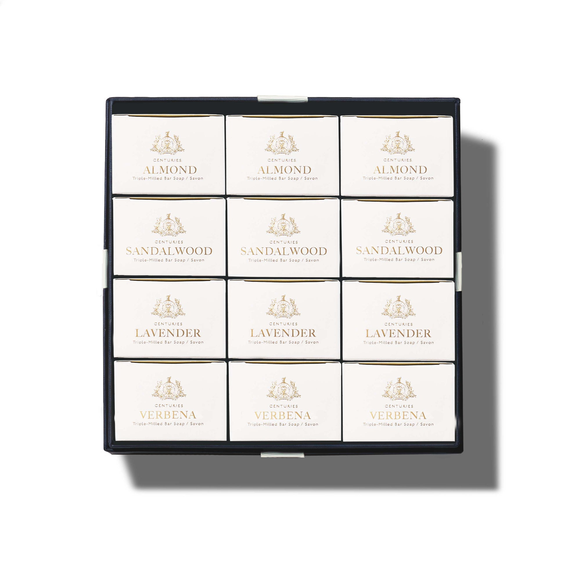 This set lets you try our best-selling soaps from the Centuries soap collection: sweet Almond, fresh Lavender, citrusy Verbena, and warm Sandalwood. These bars will scent the air and lift your spirits as they treat your skin with a nourishing lather that rinses clean.