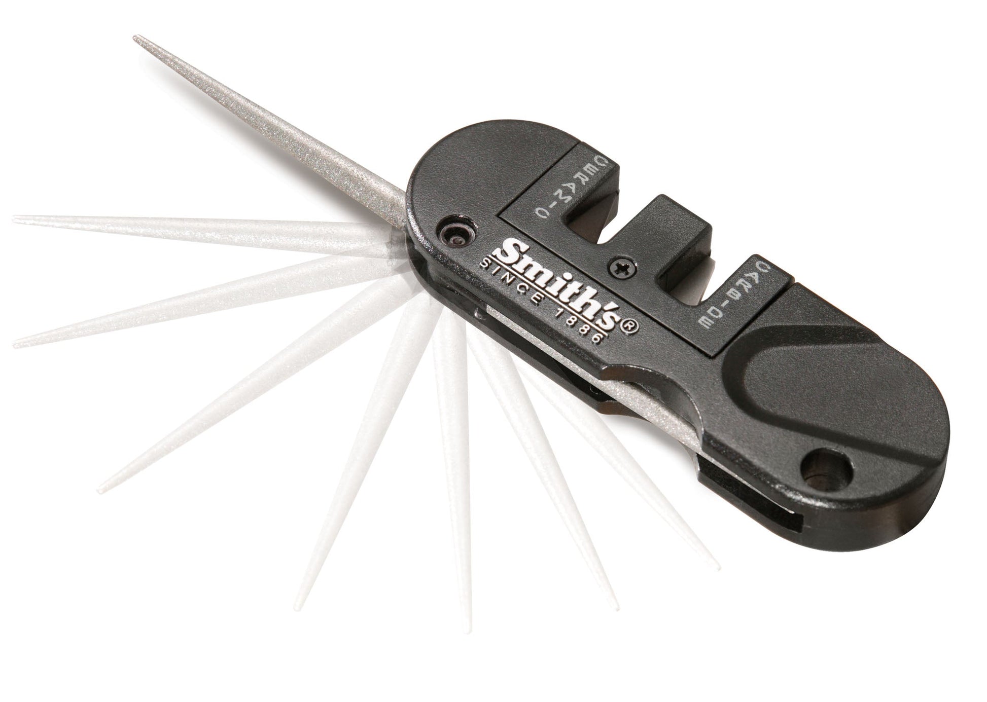 Smith’s new “Pocket Pal” Multi-Functional Knife Sharpener features pre-set crossed carbides and ceramic stones, which provide the “Perfect Edge” every time. Carbides provide quick edge setting, and the specially shaped ceramic stones are designed to give you a razor sharp edge on either standard or serrated edges. The carbide and ceramic stones are reversible and replaceable. A fold out, tapered round, diamond coated rod is designed for sharpening serrated as well as standard edges. Unit is compact, lightweight, durable, and comes with a lanyard hole.