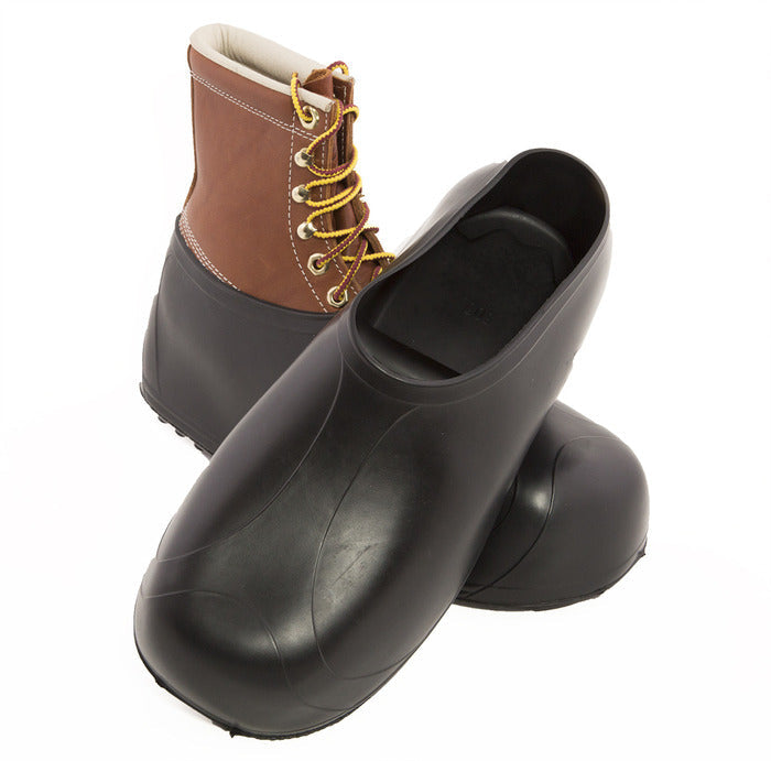 With its reinforced heel and toe, our work overshoes are designed to stand up to tough daily wear. That's why they are considered the industry standard. Injection molded, seamless construction for 100% waterproof protection. Excellent tensile strength, ease of stretch and tear resistance for more durability, better comfort, and easier on and off. Will not crack or stiffen in the coldest of weather. Deep cleated outsole spits out debris for good slip resistance and longer wear. Heavy duty heel kick-off cleat for easy no hands removal. No lining for easy cleaning and decontamination. More material in heel, toe, and sole for longer wear. Less material in the upper results in lighter weight and reduced leg fatigue.